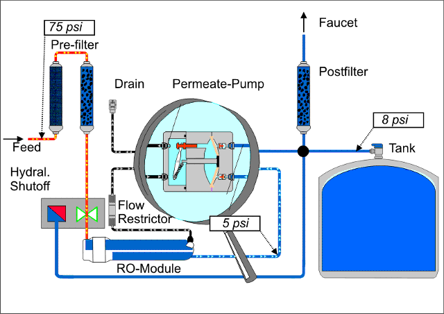 This way, it isolates your Tank from the membrane and lets your membrane perform like in an athmospheric tank system. Look at our Computer animation below. You can click on the image to enlarge it. If you click on the pump you get a detailed view on the pump only.