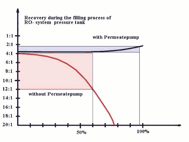 The red curve shows the changes in recovery on riseing tank pressure. To minimize the problem shut off devices are used that allow to produce about 55-75% of line pressure in the storage tank. Note, that in practise the whole storage tank is not used very often. Normally you work out of the top portion of the tank.